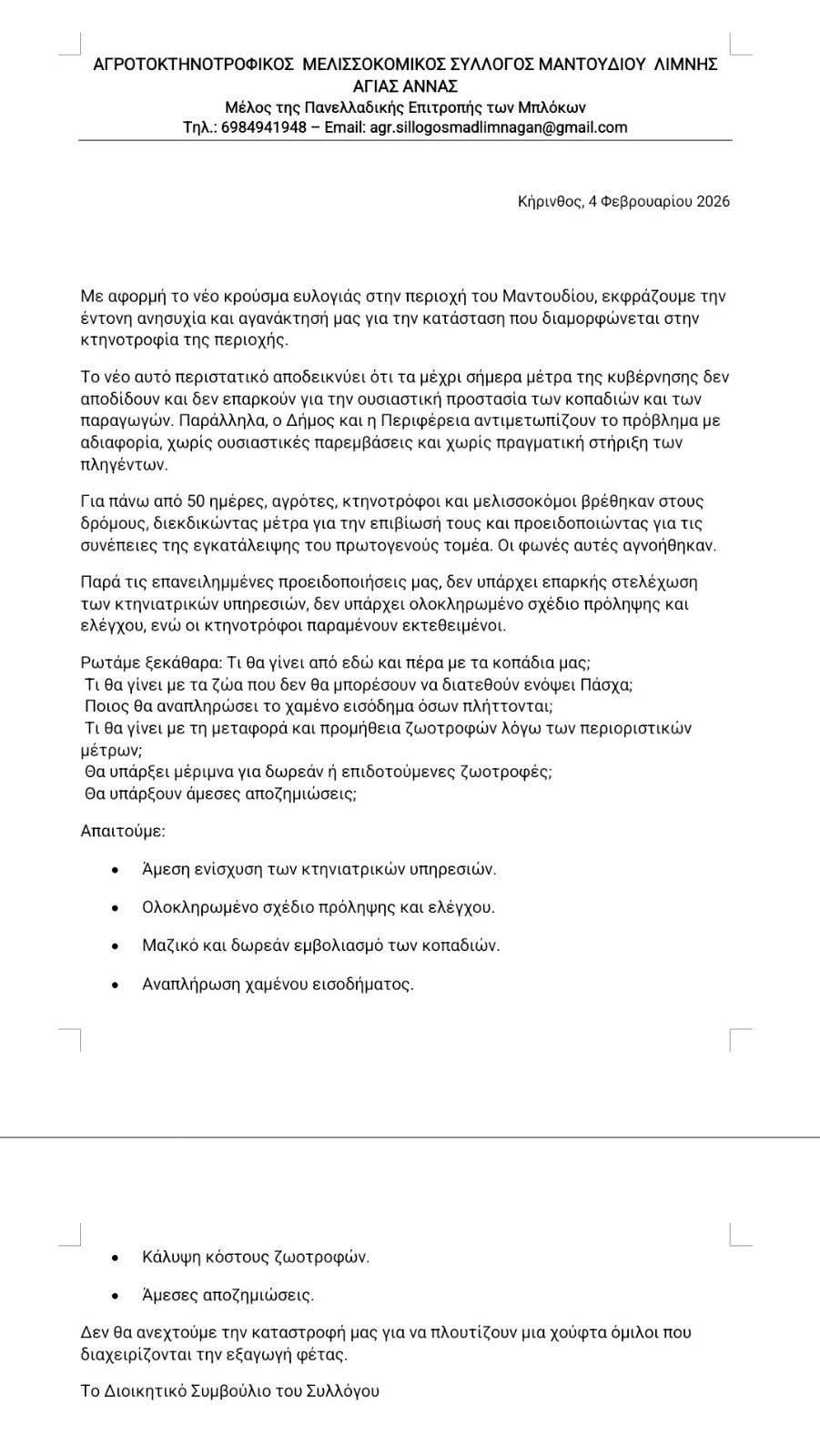 Η ανησυχία των αγροκτηνοτρόφων Μαντουδίου Λίμνης Αγ. Άννας