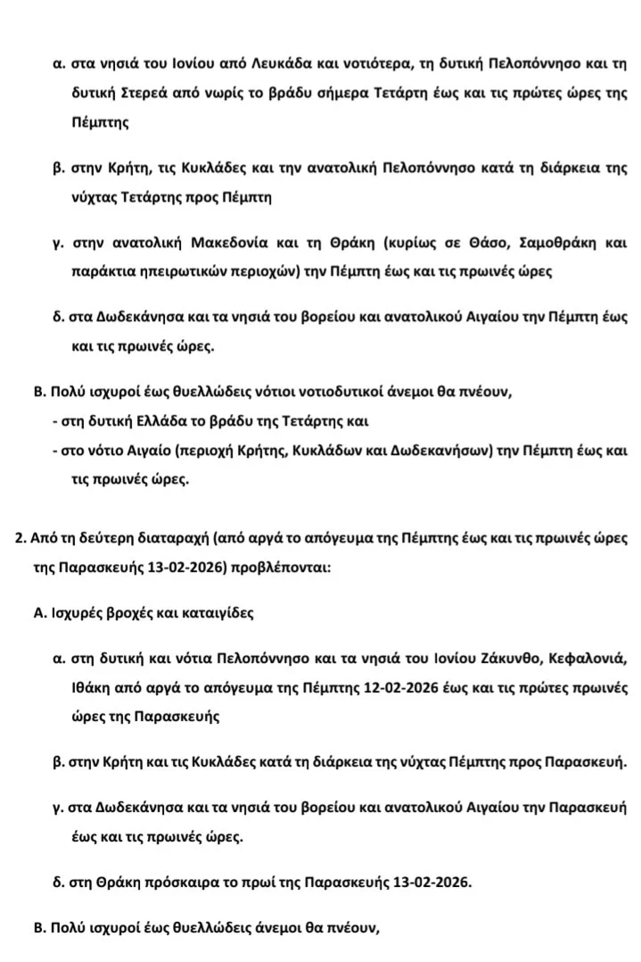 Επιδείνωση του καιρού από σήμερα Τετάρτη το βράδυ έως τις πρωινές ώρες της Παρασκευής 13/02 με ισχυρές βροχές και καταιγίδες και πολύ ενισχυμένους ανέμους.