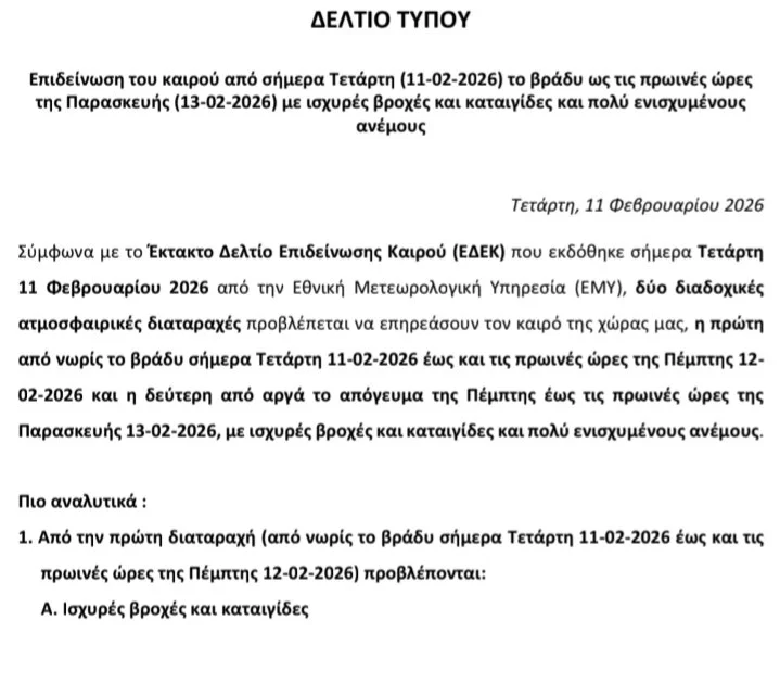 ⚠️ Έκτακτο Δελτίο Επιδείνωσης Καιρού