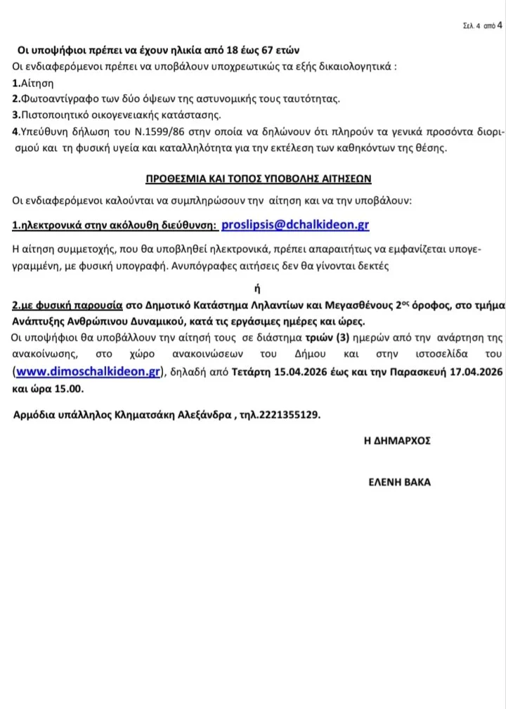 Προσλήψεις προσωπικού 8μηνης διάρκειας στον Δήμο Χαλκιδέων