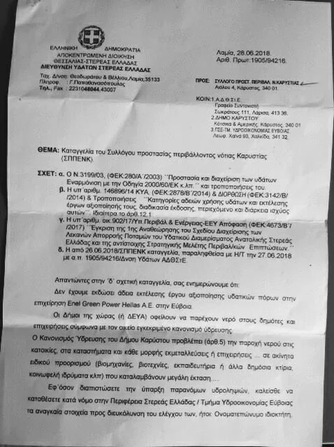 Μόλις όμως τους επιδείχτηκαν κάποιες καταγγελίες, όπως αυτή του ΣΠΠΝΕΚ στην περιφέρεια, που η απάντηση της Αποκεντρωμένης Διοίκησης Θεσσαλίας σχετικά με άδειες χρήσης νερού του Δήμου Καρύστου, που αναφέρει ότι την αρμοδιότητα και την ευθύνη την έχει ξεκάθαρα ο Δήμος, ..επιφυλαχτήκαν να απαντήσουν!!!!