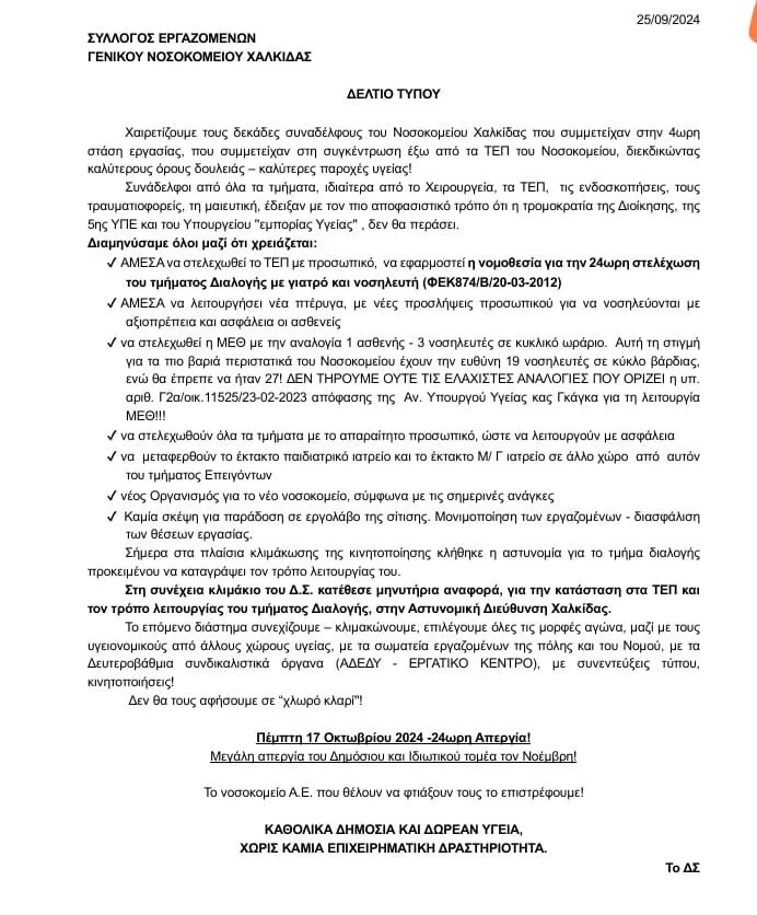 Ο Σύλλογος εργαζόμενων Γεν. Νοσοκομείου Χαλκίδας, μετά στάση εργασίας που πραγματοποίησε αποφάσισε να προβεί σε μαζική κινητοποίηση. Πιο αναλυτικά στην ανακοίνωσή του: