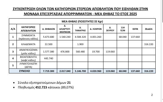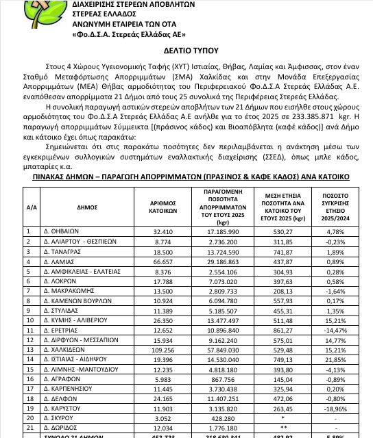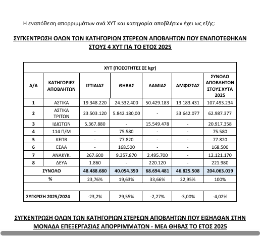 Φορέας Διαχ. στερεών Αποβλήτων Στερεάς: οι ετήσιες ποσότητες Δήμων & ΧΥΤΑ στο 2025