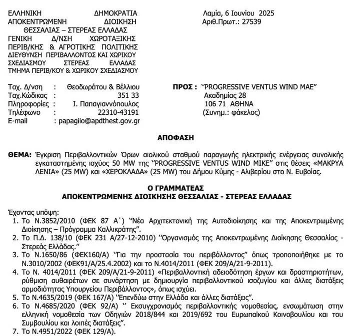 ΘΕΜΑ: Έγκριση Περιβαλλοντικών Όρων αιολικού σταθμού παραγωγής ηλεκτρικής ενέργειας συνολικής εγκαταστημένης ισχύος 50 MW της ‘’PROGRESSIVE VENTUS WIND ΜΙΚΕ’’ στις θέσεις «ΜΑΚΡΥΑ ΛΕΝΙΑ» (25 MW) και «ΧΕΡΟΚΛΑΔΑ» (25 MW) του Δήμου Κύμης - Αλιβερίου στο Ν. Ευβοίας.