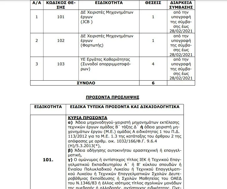 Ο Δήμος Διρφύων-Μεσσαπίων ανακοίνωσε την πρόσληψη προσωπικού με σύμβαση εργασίας ιδιωτικού δικαίου ορισμένου χρόνου διάρκειας από την υπογραφή της σύμβασης έως 28/02/2021, συνολικού αριθμού έξι (6) ατόμων των κάτωθι ειδικοτήτων, προς κάλυψη εποχικών και κατεπειγουσών αναγκών στην υπηρεσία καθαριότητας του Δήμου.