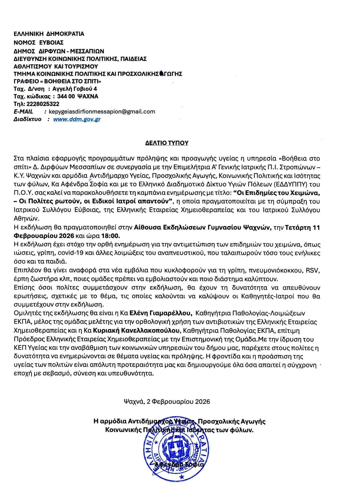 Στα πλαίσια εφαρμογής προγραμμάτων πρόληψης και προαγωγής υγείας η υπηρεσία «Βοήθεια στο σπίτι» Δ. Διρφύων Μεσσαπίων σε συνεργασία με την Επιμελήτρια Α’ Γενικής Ιατρικής Π.Ι. Στροπώνων – Κ.Υ. Ψαχνών και αρμόδια Αντιδήμαρχο Υγείας, Προσχολικής Αγωγής, Κοινωνικής Πολιτικής και Ισότητας των φύλων, Κα Αφένδρα Σοφία και με το Ελληνικό Διαδημοτικό Δίκτυο Υγιών Πόλεων (ΕΔΔΥΠΠΥ) του Π.Ο.Υ. σας καλεί να παρακολουθήσετε τη καμπάνια ενημέρωσης με τίτλο: “Οι Επιδημίες του Χειμώνα, – Οι Πολίτες ρωτούν, οι Ειδικοί Ιατροί απαντούν”, η οποία πραγματοποιείται με τη σύμπραξη του Ιατρικού Συλλόγου Εύβοιας, της Ελληνικής Εταιρείας Χημειοθεραπείας και του Ιατρικού Συλλόγου Αθηνών.