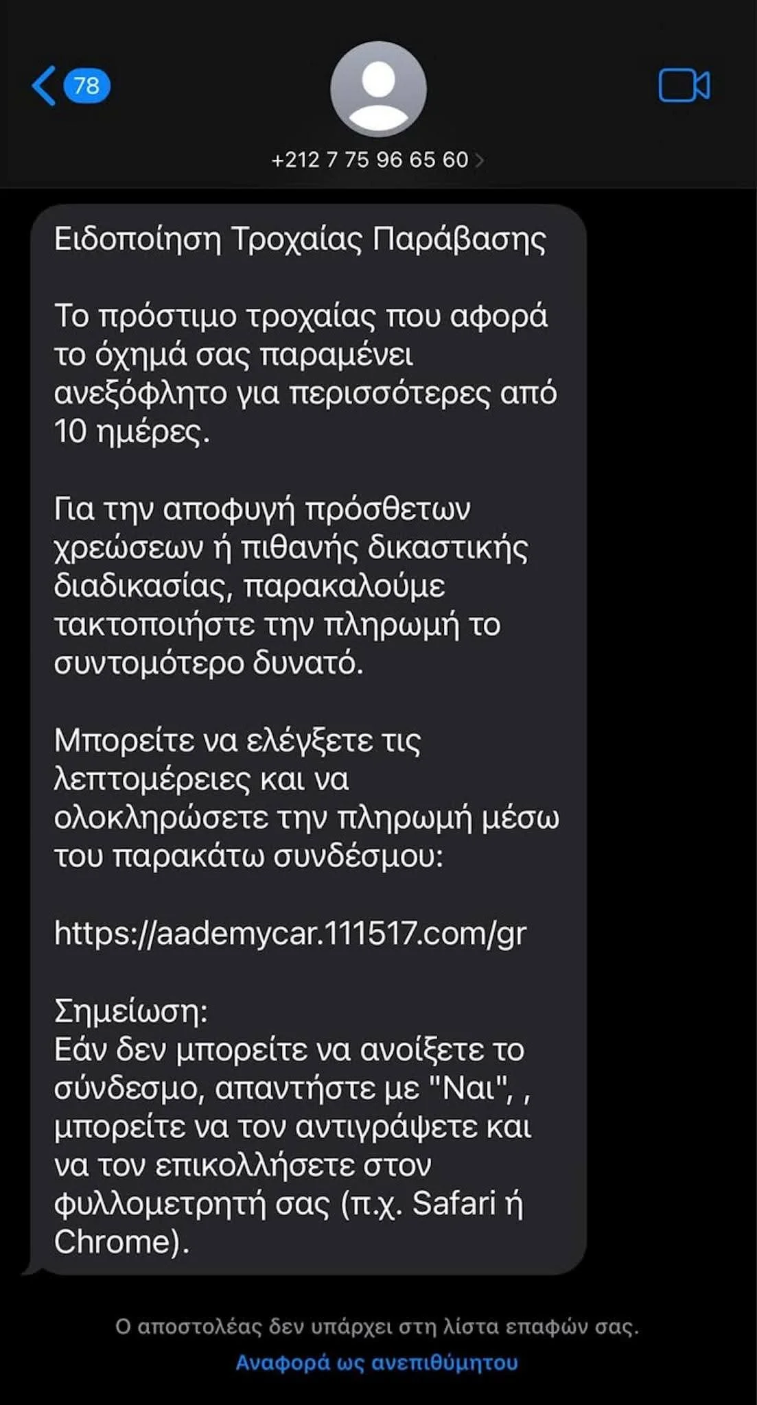 ⚠️ Παραπλανητικά SMS ως δήθεν ειδοποίηση τροχαίας παράβασης