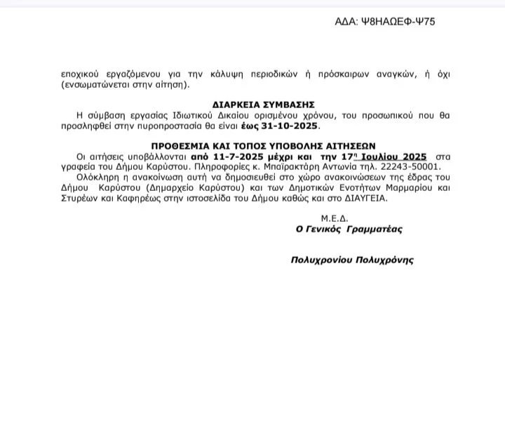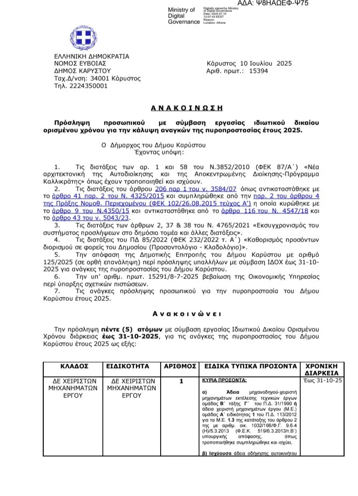 Ο Δήμος Καρύστου ανακοινώνει την πρόσληψη πέντε (5) ατόμων με σύμβαση εργασίας Ιδιωτικού Δικαίου Ορισμένου Χρόνου διάρκειας έως 31-10-2025, για τις ανάγκες της πυροπροστασίας του Δήμου Καρύστου έτους 2025.