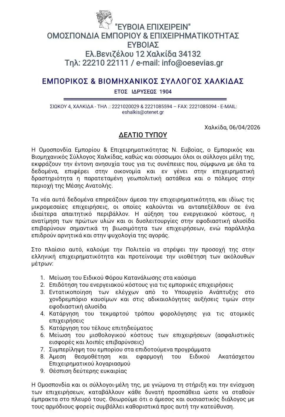 Το Δελτίο Τύπου του Εμπορικού & Βιομηχανικού Σύλλογου Χαλκίδας, Εύβοιας φίλοι…
